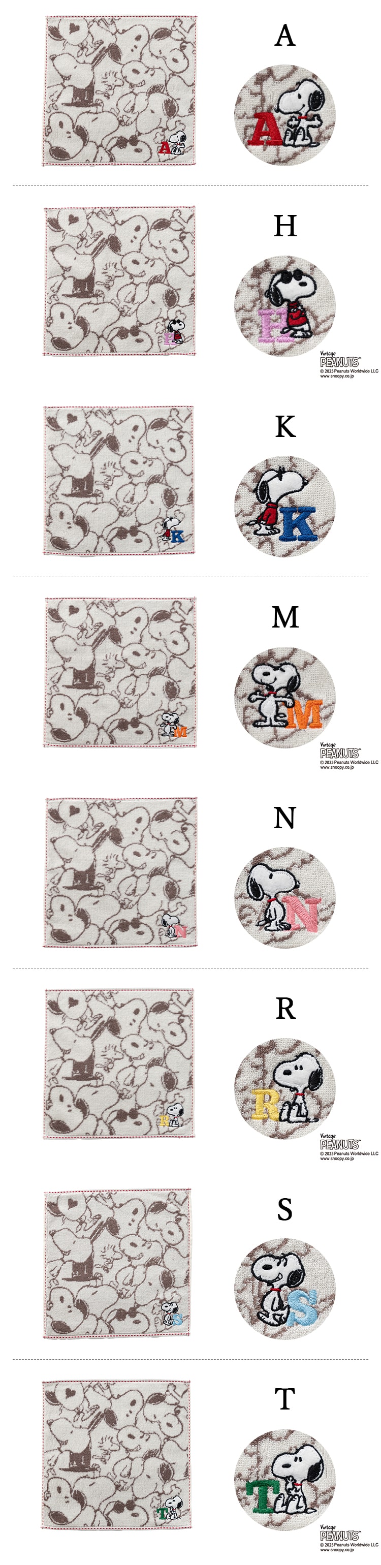 9種類のイニシャルとスヌーピーの刺繍を組み合わせたタオルハンカチ。