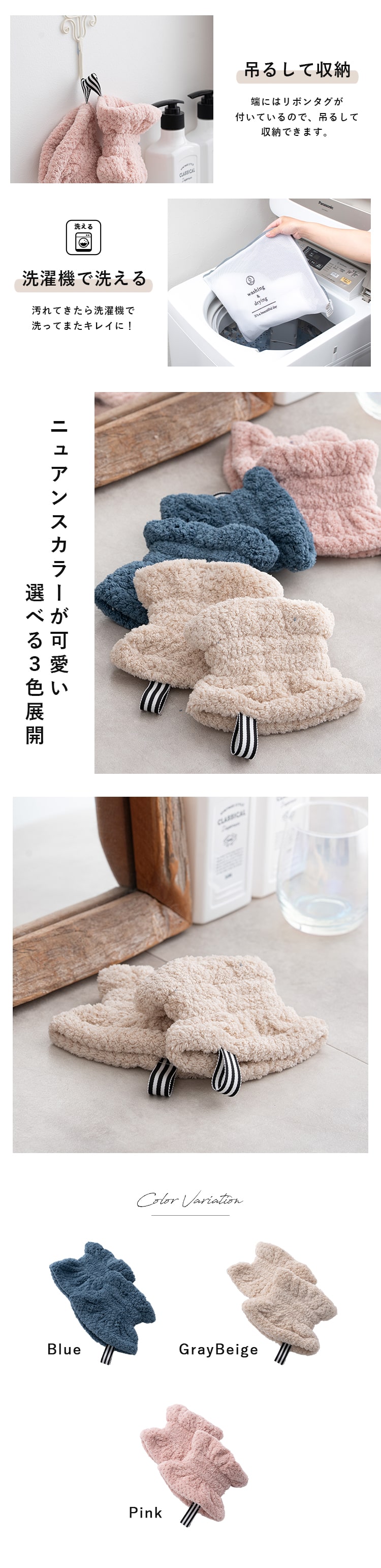使わないときは吊るして収納でき、汚れたら洗濯機で洗えるので管理も簡単♪
