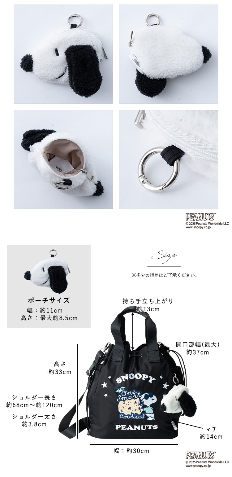 気軽に使えるナイロン素材に前面のスヌーピーのイラストの刺繍とスヌーピーのフェイス型ミニポーチがポイント。