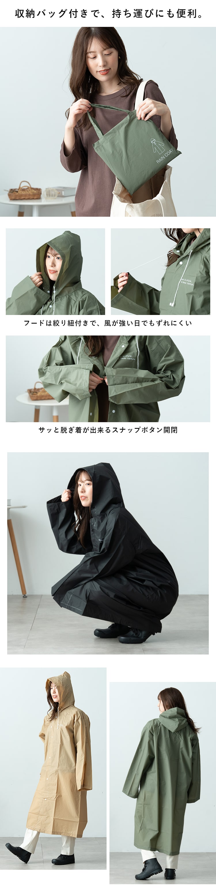 軽量設計で着心地も軽やか。収納バッグ付きで、バッグに入れてもかさばらず、持ち運びにも便利。