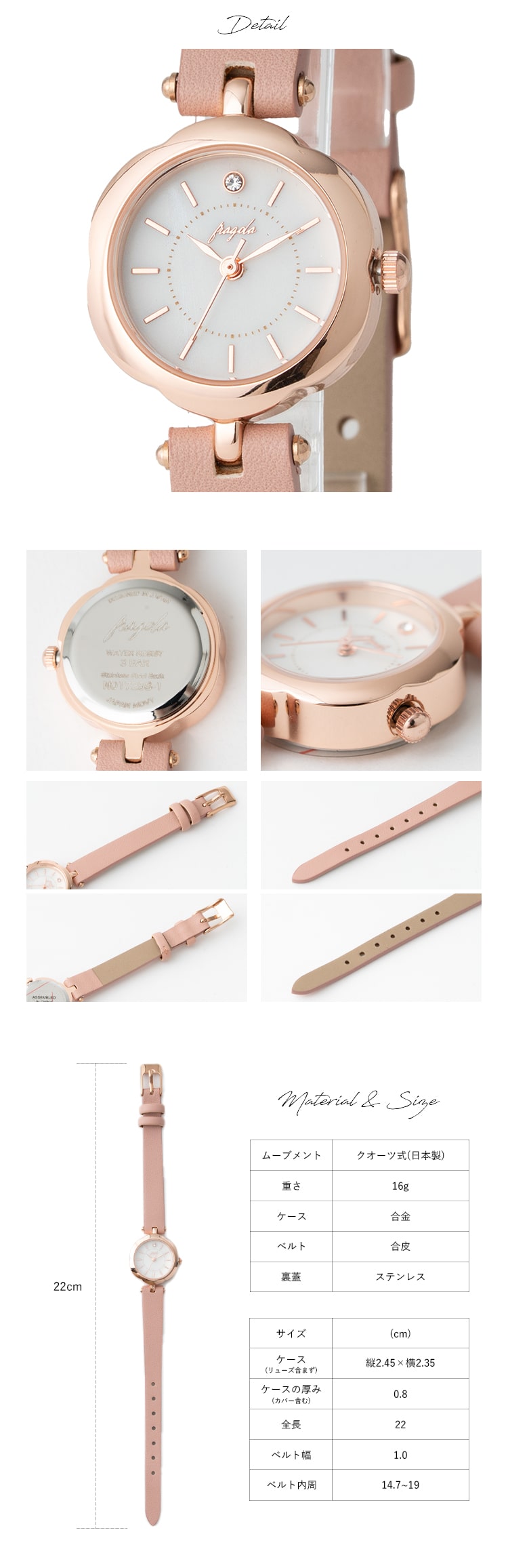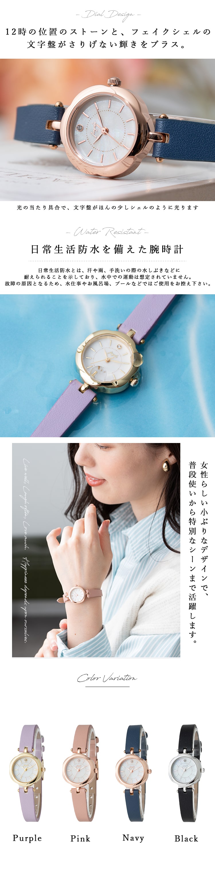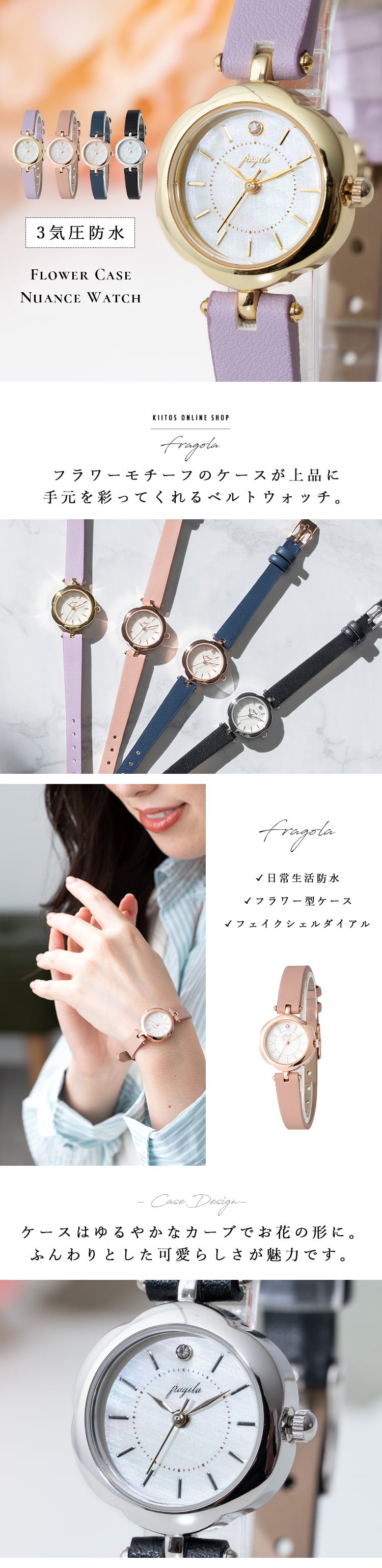 カラーごとに異なるケースカラーもポイントで、合皮ベルトはカジュアルからフォーマルまで合わせやすく、普段使いから特別なシーンまで活躍します。