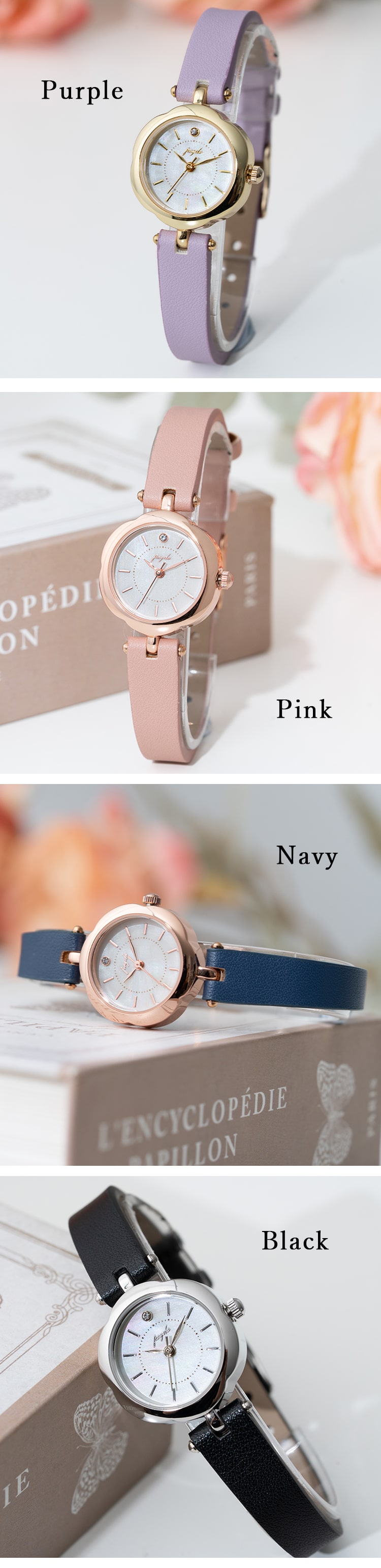 ふんわりしたお花モチーフのケースが上品に手元を彩るフラワーケースニュアンスカラー合皮ベルトウォッチ。