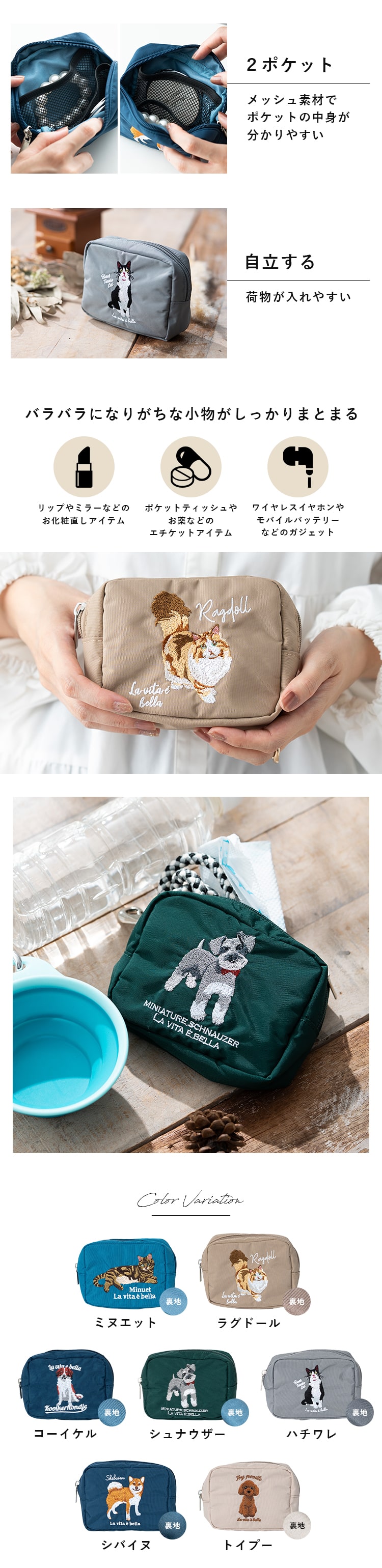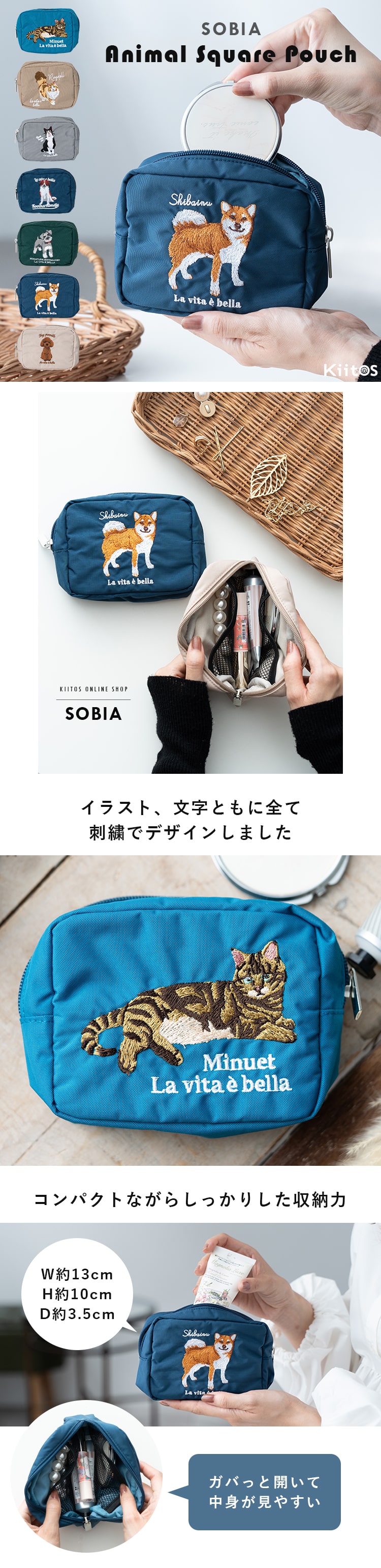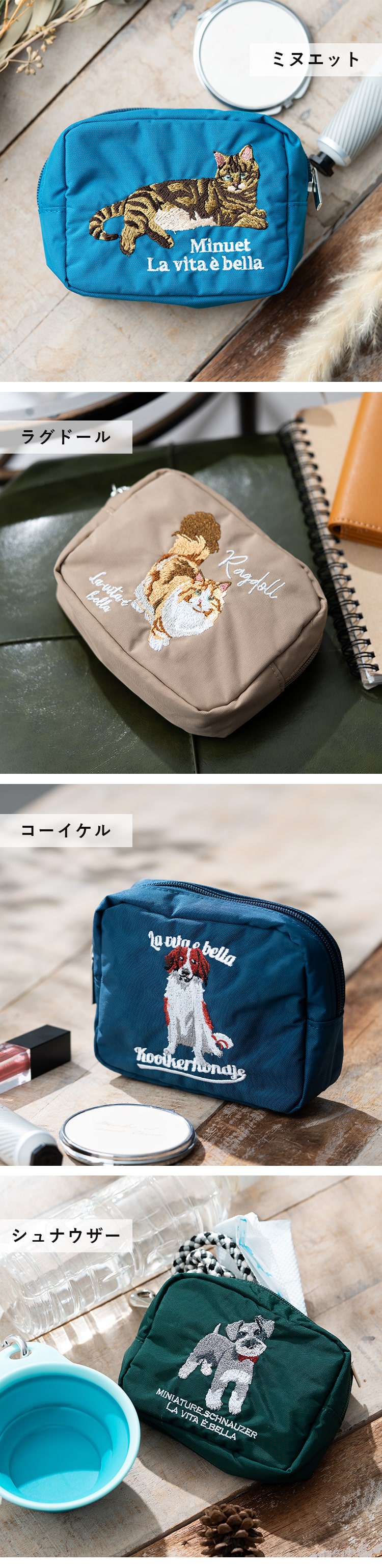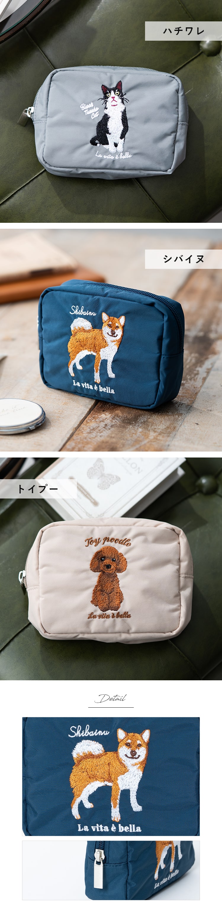 愛嬌のある表情が可愛い犬と猫の刺繍がポイントのスクエアミニポーチ。