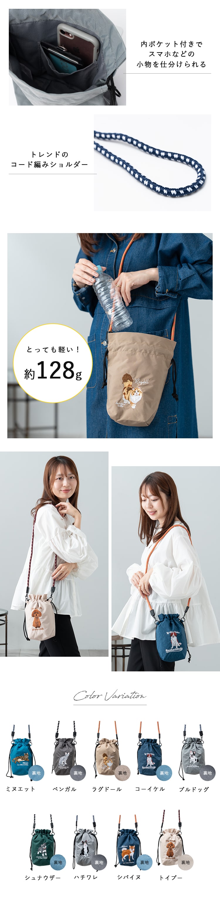 愛嬌のある表情が可愛い犬と猫の刺繍がポイントのコードショルダーバッグ。