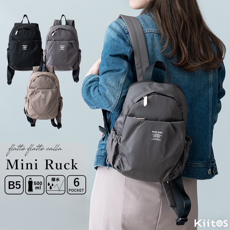 メイン収納、あおりポケット両方500mlペットボトルが横向きに入るサイズ感で、お出掛け必需品がまとめて持ち運べます。