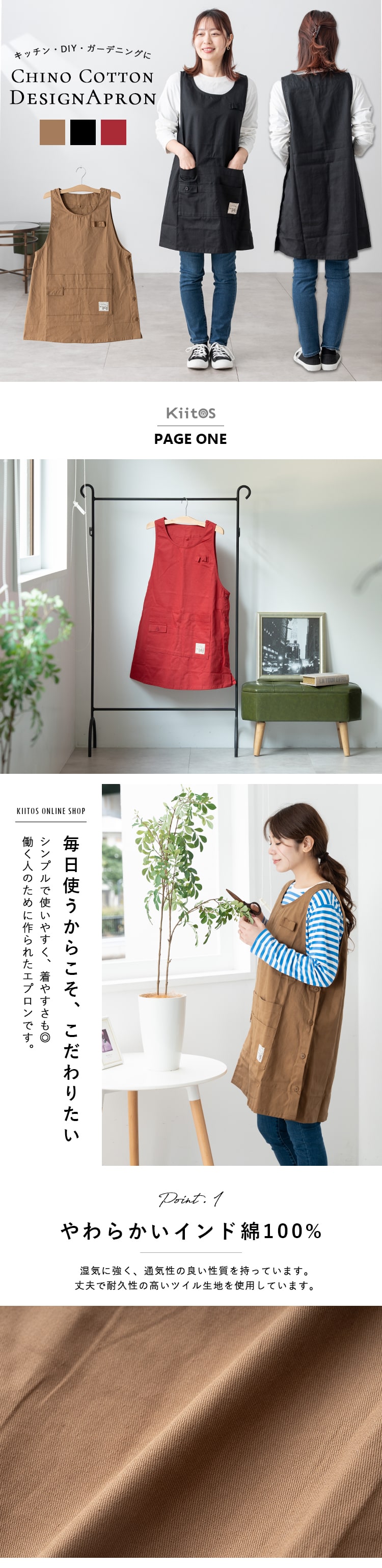 しっかりと丈夫なチノ素材を使用した脇ボタンタイプのエプロン。