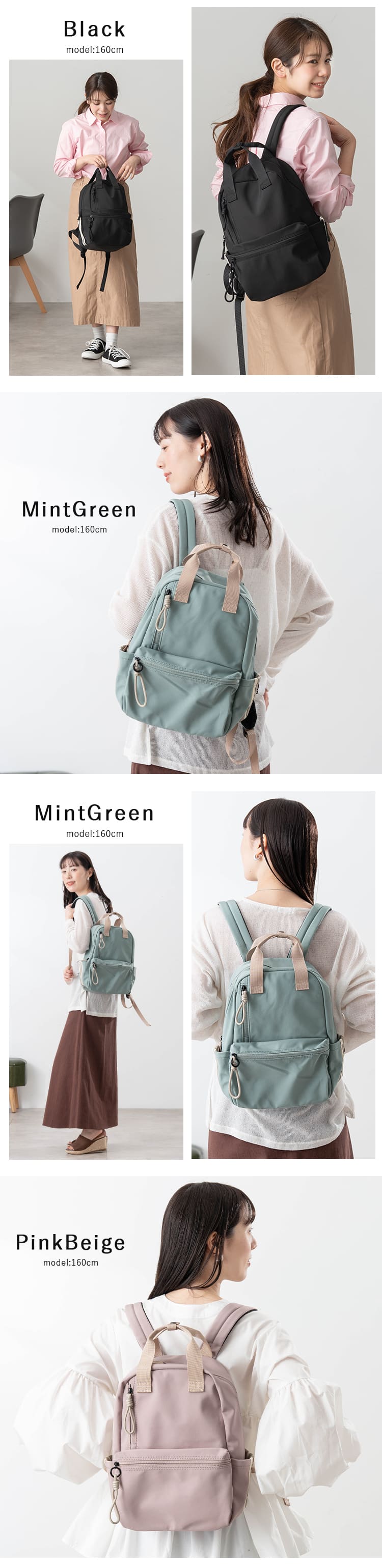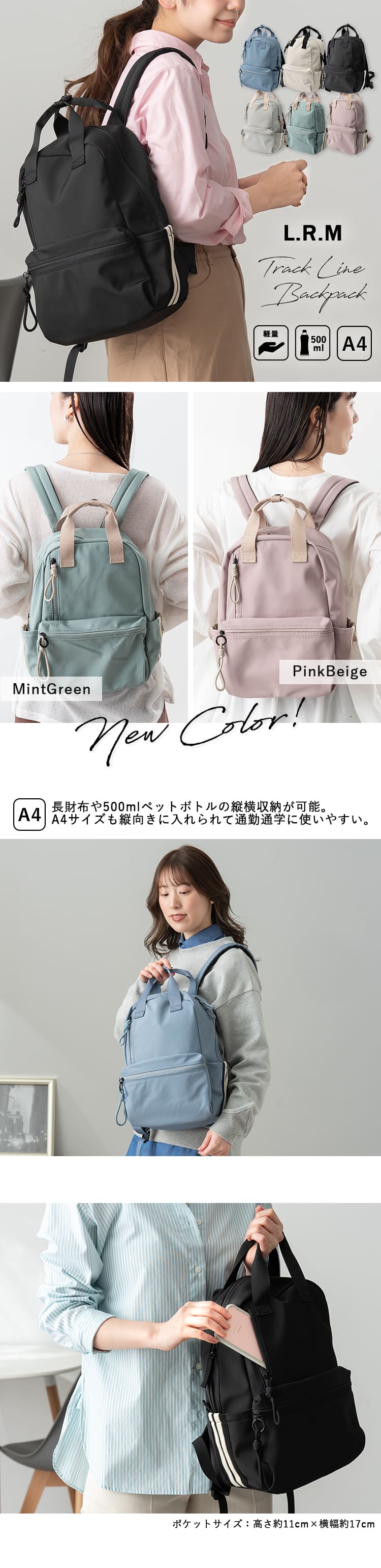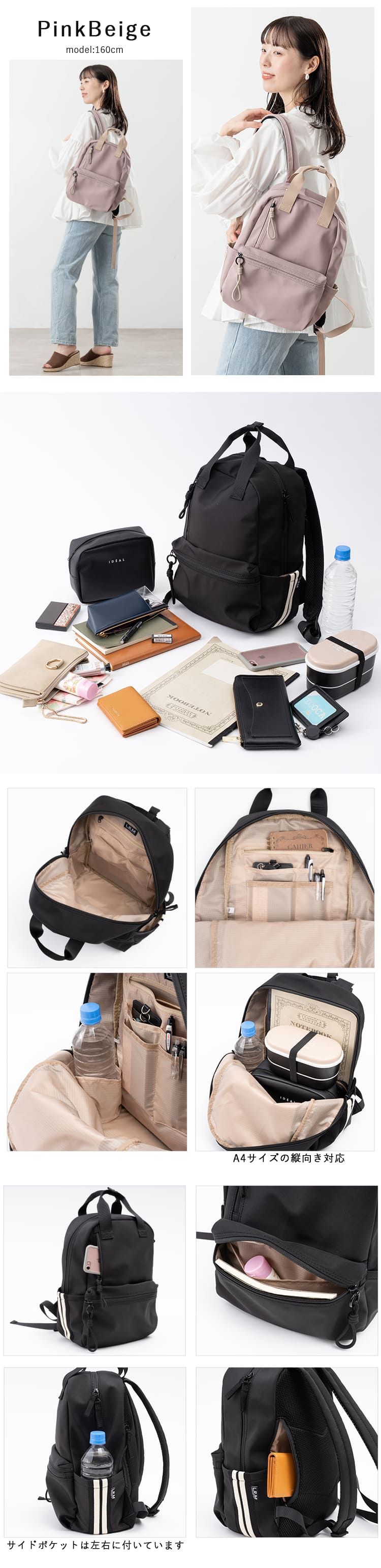 メイン収納部分はA4サイズが縦向きに入れられる大きさで、長財布や500mlペットボトルは縦横どちら向きでも収納することができるので、旅行などのアクティビティはもちろん、通勤通学にもおすすめです♪