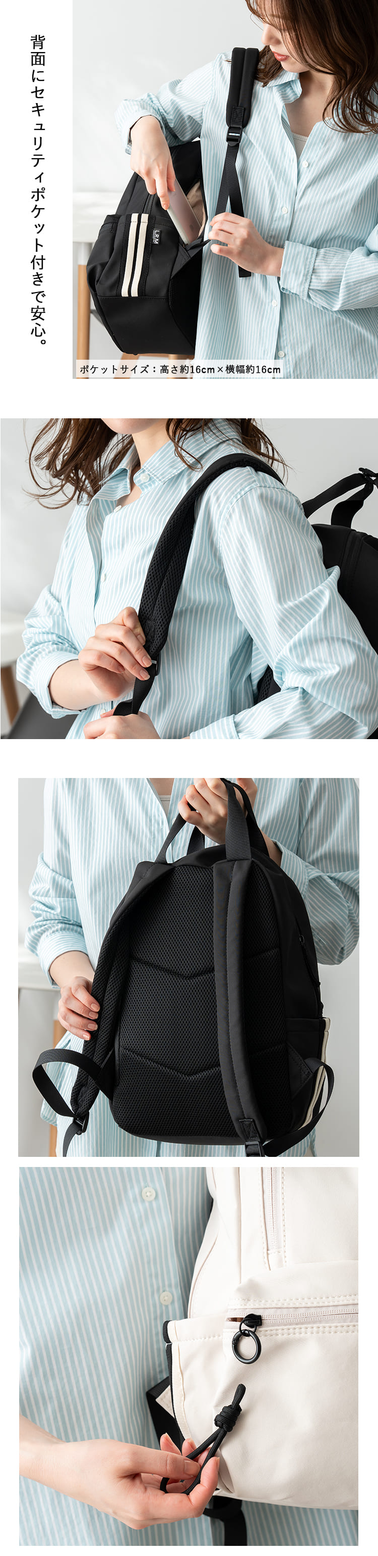 肩への負担を軽減するウレタンショルダーと、蒸れにくくするメッシュ素材の背中あてで身体のこともしっかり考えました。