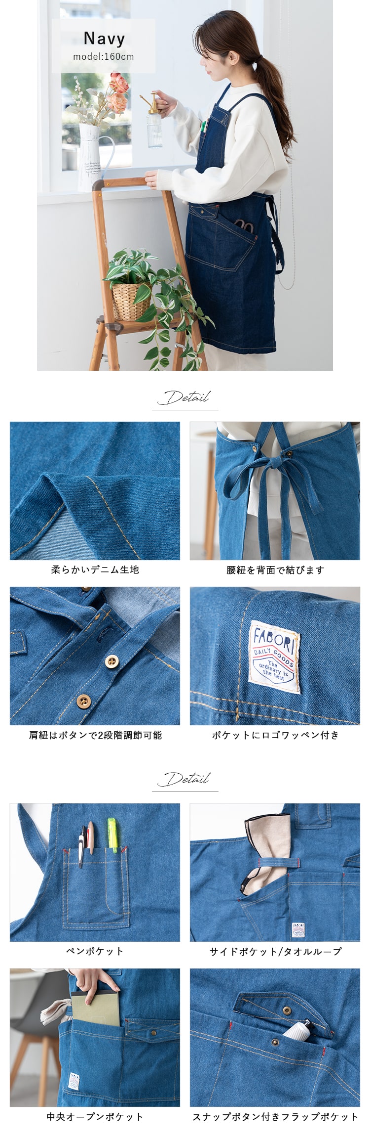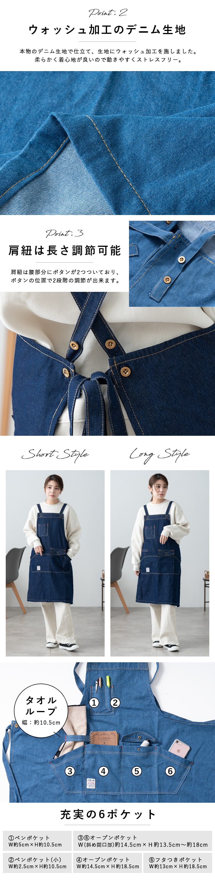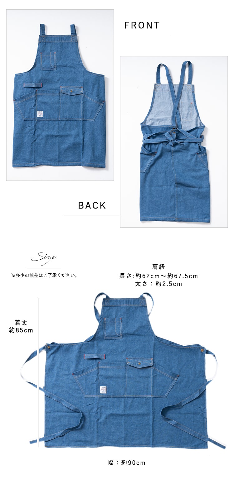 本物のデニム生地にウォッシュ加工を施して着心地よく仕立てたデニムエプロン。