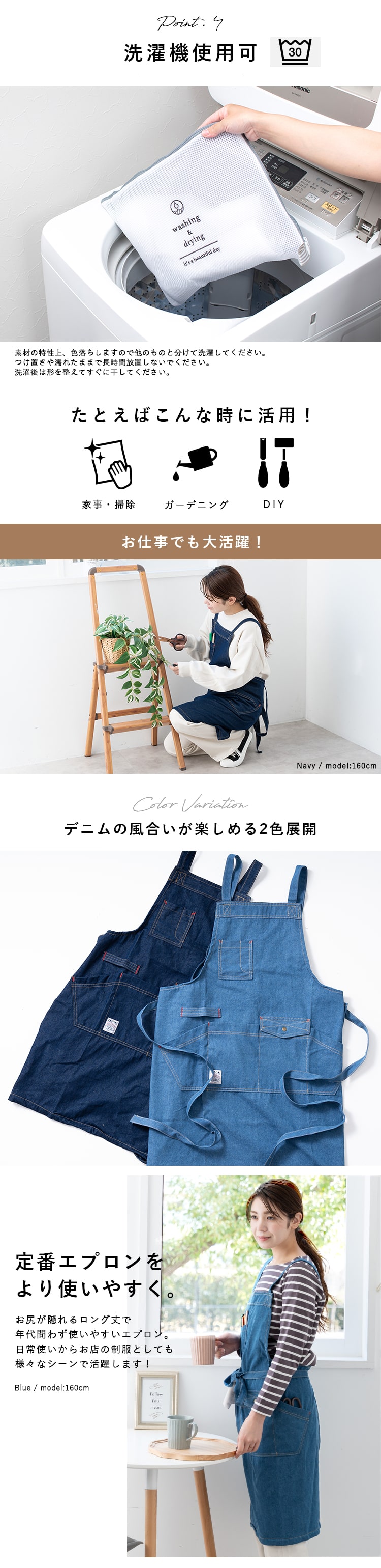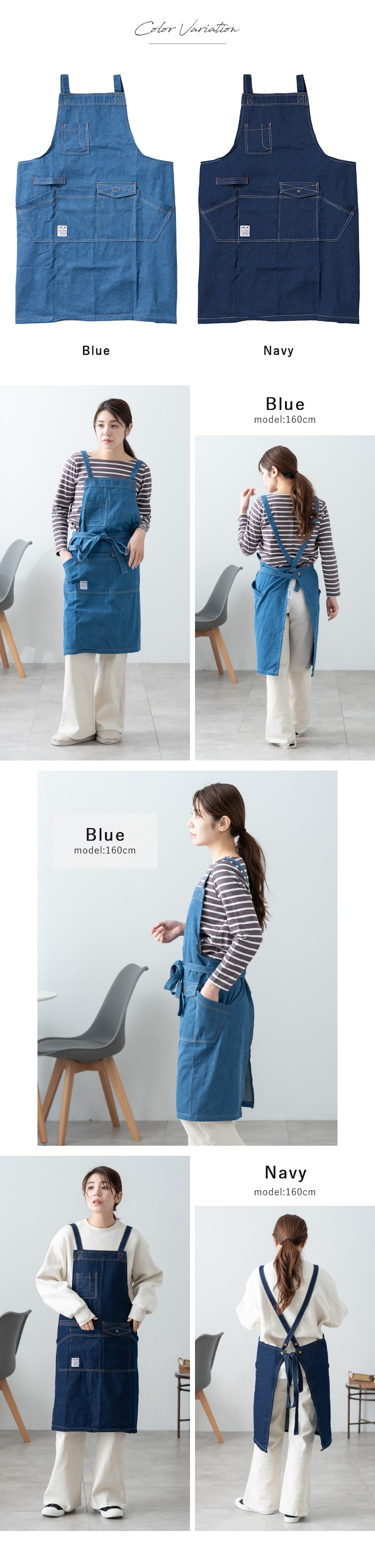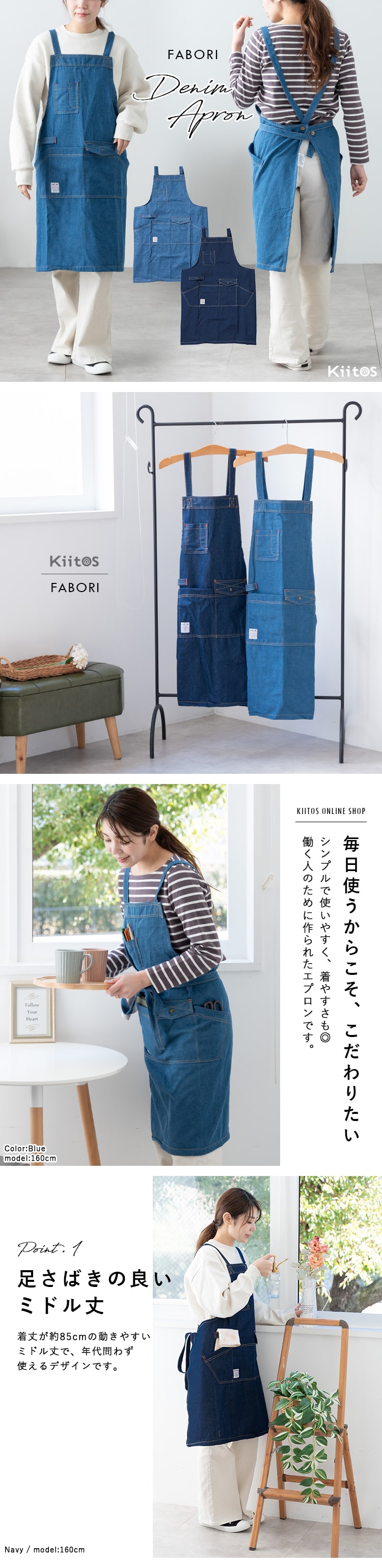 本物のデニム生地にウォッシュ加工を施して着心地よく仕立てたデニムエプロン。