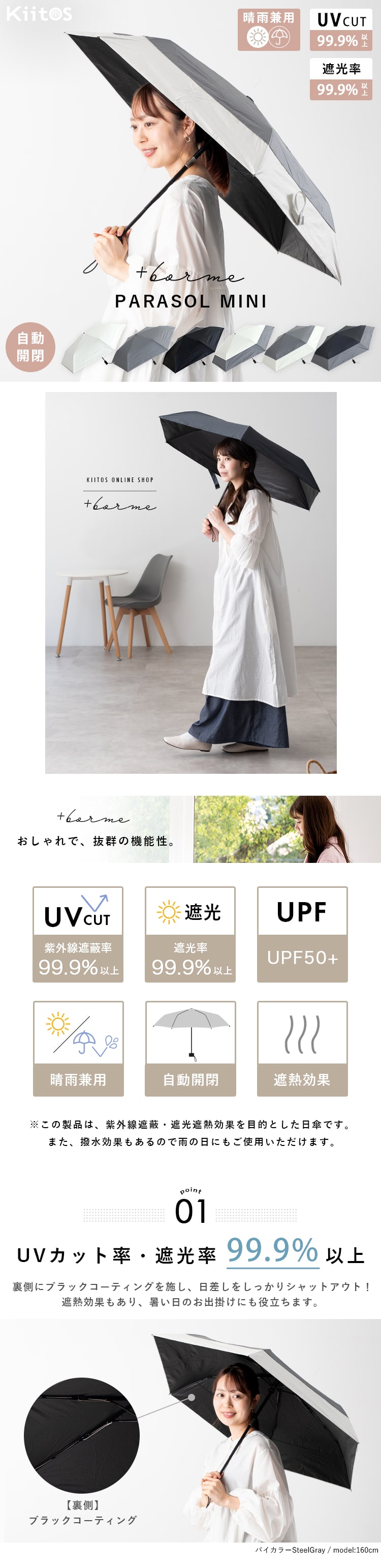 ※本製品は晴雨兼用となっておりますが本来は紫外線防止を目的に開発された生地に撥水加工を施した商品です。激しい雨や長時間雨傘としてのご使用は生地に雨水が染み込む場合がございますので、ご注意下さい。