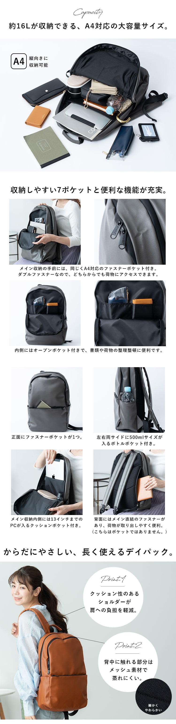 約16Lの荷物が収納できる大容量サイズで、オンオフ問わずお使いいただけます。